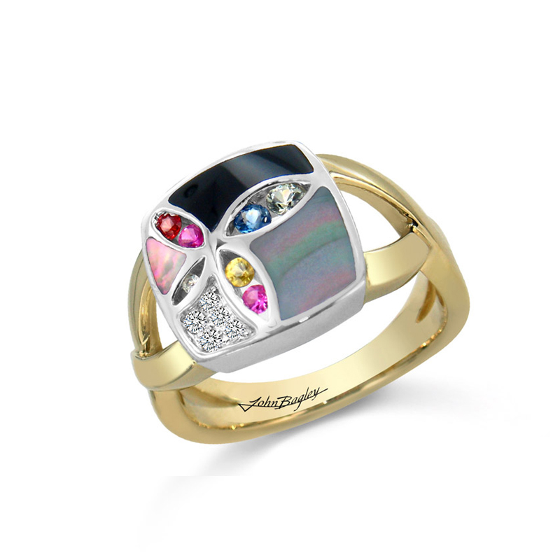14K Yellow gold / 14K White gold Inlay ring with 0.03cts.T.W. of Diamond Accents, 0.22cts.T.W. of Multi-Color Sapphires, Black Agate, Black &Brown MOP