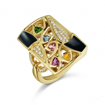 14K Yellow gold Inlay ring with 0.23cts.T.W. of Diamond Accents, 0.73cts.T.W. of Multi color Sapphires, Black MOP x2