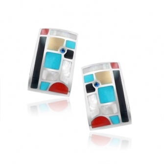 925 Sterling Silver/18K Yellow gold inlay Earring with 0.04cts.T.W.of Blue Sapphires, Black Agate x4, Mother of pearl x6, Red Agate x4, Turquoise x6