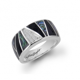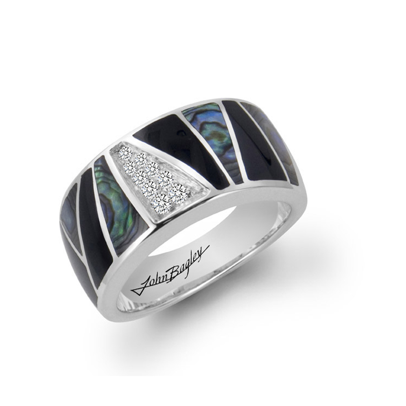925 Sterling Silver Inlay ring with 0.06cts.T.W.of Diamond Accents, Black Agate & Abalone