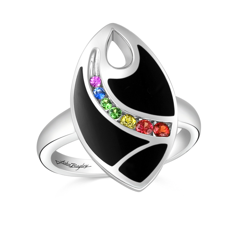 925 Sterling Silver Inlay ring with 0.17cts.T.W.of Multi-Color Sapphires & Tsavorites, Black Agate