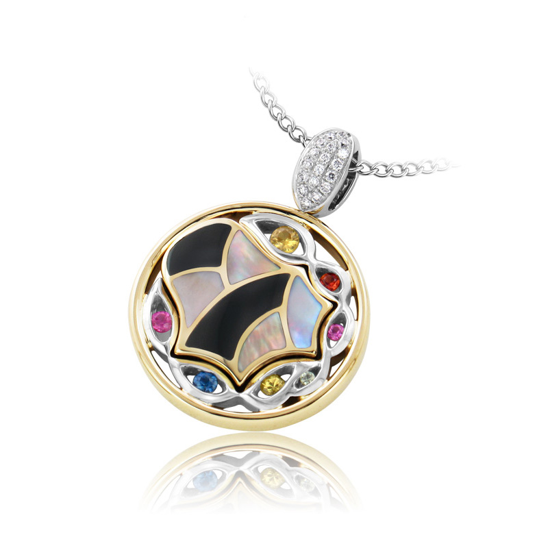 14K Yellow gold /14K White gold with .09 T.W. of Multi-Color Sapphires, Black Agate x2, Pink MOP x2, Brown MOP x2